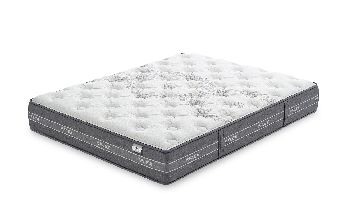 El núcleo del colchón está compuesto por muelles ensacados cosidos individualmente y recubiertos por una bolsa textil actuando como amortiguadores totales.