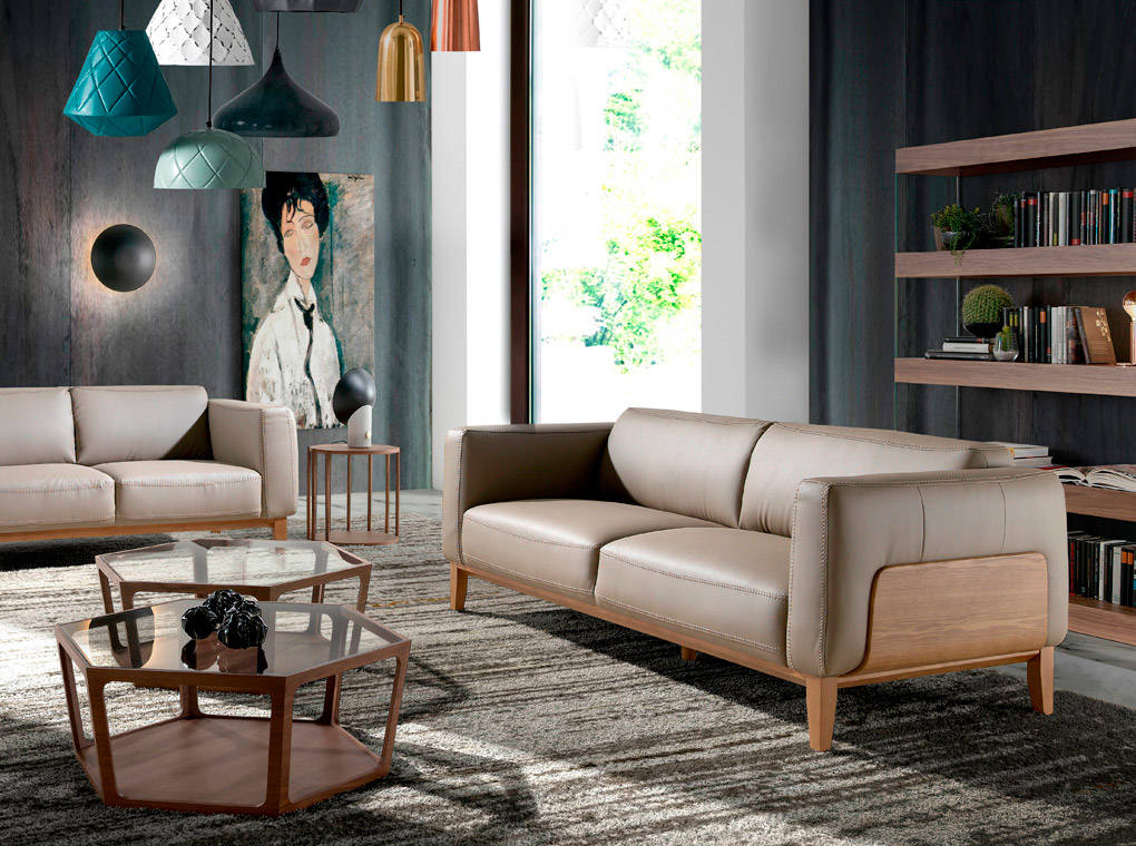 Sofá 3 Plazas Tapizado en Piel con Estructura de Madera de Nogal